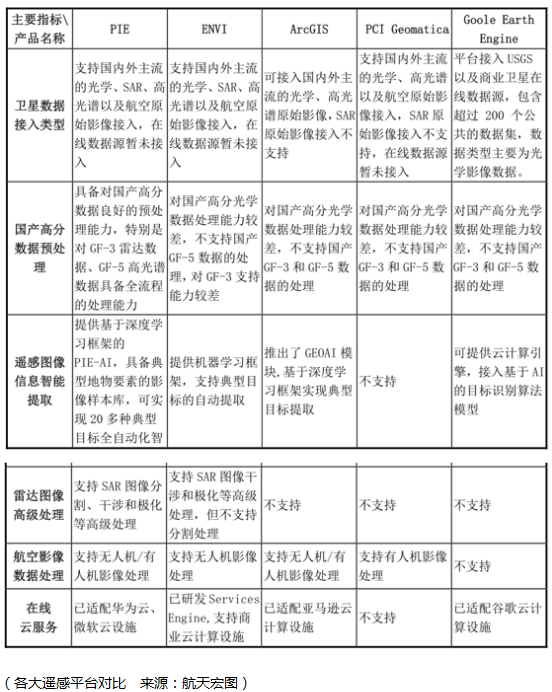 可以看到在各大参数的对比中航天宏图的PIE平台的优势存在,但仅限于功能上,而具体的功能到多少精度的水平这个是不清楚的。
