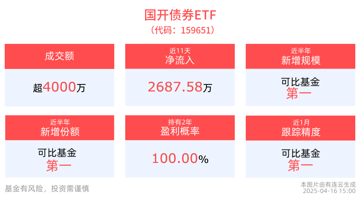 截至2025年4月16日,國開債券ETF(159651)上漲0.01%,最新價報105.85元。拉長時間看,截至2025年4月16日,國開債券ETF近1年累計上漲2.19%。