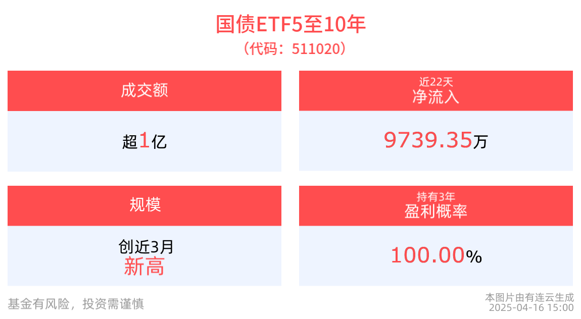 流動性方面,國債ETF5至10年盤中換手10.62%,成交1.52億元,市場交投活躍。拉長時間看,截至4月16日,國債ETF5至10年近1年日均成交3.10億元。