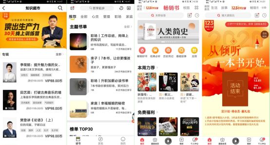 頭部知識付費平台基本引入算法推薦模式,在對于用戶數據全面標簽化基礎上,平台做到知識付費内容的“千人千面”能滿足用戶個性化内容消費需求,並且創造沈浸式體驗,讓知識付費的“信息”主動找到人,最終也能提升用戶購買精品内容、付費成為會員的成功率。往往在這樣的平台用戶規模大、流量高,能夠吸引優質内容生産者“薄利多銷”,降低知識普及的門檻。而知識付費領域也形成類似電商平台的“造節促銷”活動, 如“423聽書節”、“91傾聽日”、“123傾聽計劃”等釋放會員權益,讓知識産品更親近會員以及普通用戶。