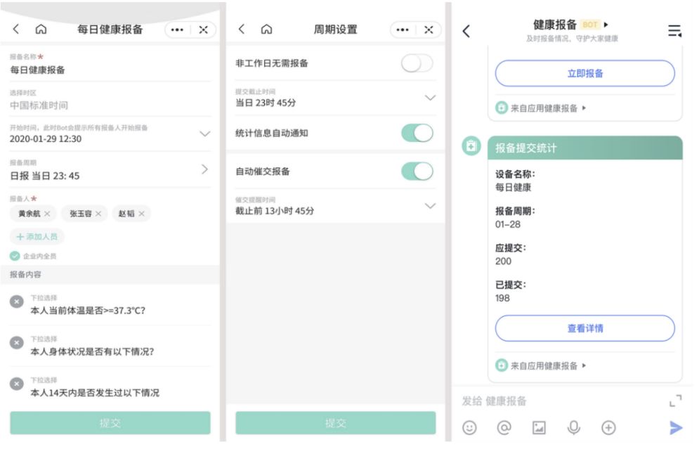 在当前抗疫的关键时期,既需要居家办公同时也需要为疫情防控的数字化观察有所作为。飞书针对疫情时期企业、学校、医院等社会组织居家隔离所需要健康管理需要,飞书紧急上线了健康管理应用帮助这些组织收集成员的体温、是否接触感染源、行程等信息统计,可做到可视化数据分析和文档导出。