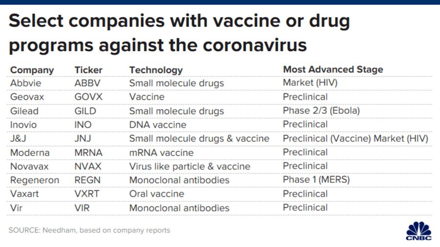 下面是針對冠狀病毒研發藥物或疫苗的公司名單: