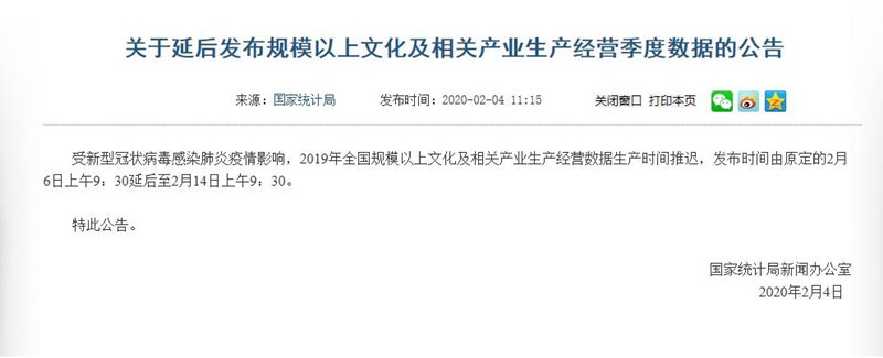中國網財經2月4日訊 據國家統計局網站消息,受新型冠狀病毒感染肺炎疫情影響,2019年全國規模以上文化及相關産業生産經營數據生産時間推遲,發布時間由原定的2月6日上午9:30延後至2月14日上午9:30。
