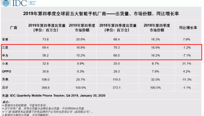 中國網科技2月4日訊 國際數據公司(IDC)今日發布2019年全球手機市場季度跟蹤報告。報告顯示,2019年第四季度全球智能手機出貨量同比下滑1.1%,總出貨量為3.688億部。