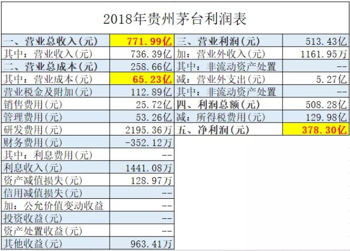 2018年,貴州茅台酒廠營業收入736.99億元,營業成本65.23億元,淨利潤378.30億元。因為賺錢太過容易,以至有人說,赤水河的水加上高粱米就可以釀造液體黃金。