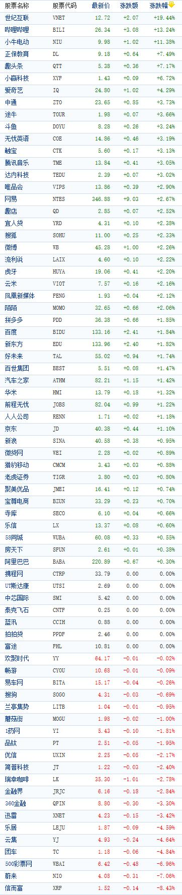 其他中概股中,小赢科技上涨6.72%,爱奇艺上涨4.29%,中通上涨3.73%,途牛上涨3.66%,斗鱼上涨3.24%,无忧英语上涨3.19%,触宝上涨3.13%,腾讯音乐(美股TME)上涨3.05%,达内科技(美股TEDU)上涨3.02%,唯品会上涨2.90%,网易(美股NTES)上涨2.67%,趣店上涨2.52%,宜人贷上涨2.38%,搜狐(美股SOHU)上涨2.33%,微博上涨2.26%,流利说上涨2.22%,虎牙上涨2.20%,陌陌上涨2.06%,新东方上涨1.82%,好未来(美股XRS)上涨1.74%,汽车之家(美股ATHM)上涨1.42%,前程无忧(美股JOBS)上涨1.22%,新浪(美股SINA)上涨0.95%,猎豹移动上涨0.88%,老虎证券(美股TIGR)上涨0.80%,寺库上涨0.66%,乐信上涨0.60%,58同城(美股WUBA)上涨0.55%,欢聚时代(美股YY)下跌0.02%,畅游(美股CYOU)下跌0.09%,易车下跌0.26%,搜狗下跌0.69%,蘑菇街(美股MOGU)下跌1.00%,品钛下跌1.95%,优信下跌2.17%,瑞幸咖啡(美股LK)下跌2.78%,360金融(美股QFIN)下跌2.84%,团车下跌4.84%。