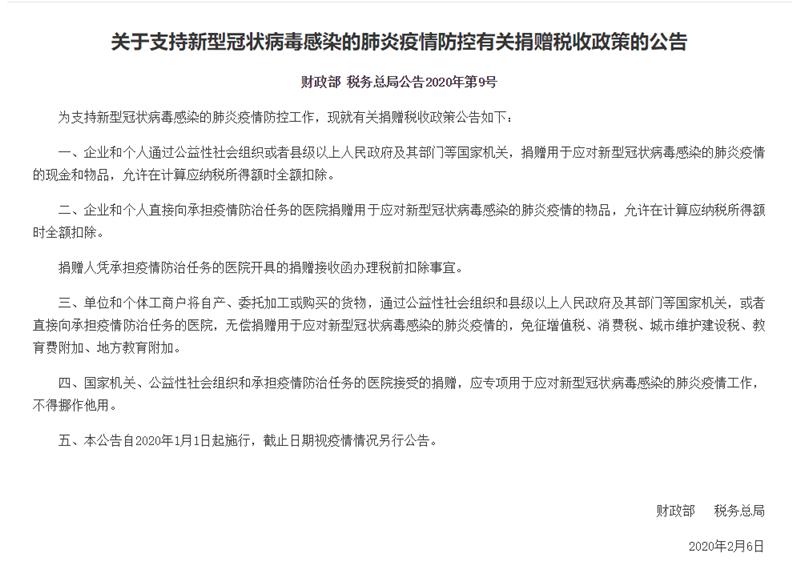 中國網財經2月7日訊 據財政部網站消息,財政部和稅務總局發布關于支持新型冠狀病毒感染的肺炎疫情防控有關捐贈稅收政策的公告。