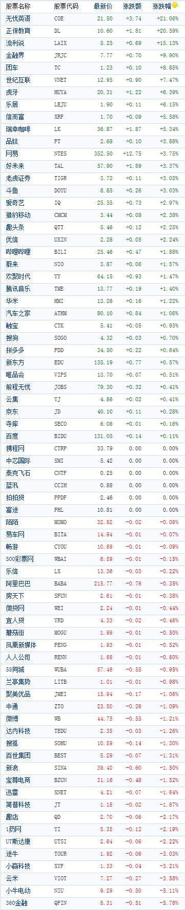 其他中概股中,世紀互聯上漲7.47%,虎牙上漲6.39%,信而富上漲5.58%,瑞幸咖啡(美股LK)上漲5.36%,品钛上漲3.88%,網易上漲3.75%,好未來(美股XRS)上漲3.37%,老虎證券(美股TIGR)上漲3.05%,鬥魚上漲3.03%,愛奇藝上漲2.97%,獵豹移動上漲2.38%,趣頭條上漲2.25%,優信上漲2.24%,哔哩哔哩上漲1.88%,蔚來上漲1.57%,歡聚時代(美股YY)上漲1.47%,騰訊音樂(美股TME)上漲1.40%,華米上漲1.22%,汽車之家(美股ATHM)上漲1.06%,搜狗上漲0.70%,新東方上漲0.57%,唯品會上漲0.51%,前程無憂(美股JOBS)上漲0.41%,寺庫上漲0.16%,陌陌下跌0.06%,易車網(美股BITA)下跌0.07%,暢遊(美股CYOU)下跌0.09%,樂信下跌0.22%,宜人貸下跌0.46%,蘑菇街(美股MOGU)下跌0.50%,58同城(美股WUBA)下跌0.95%,聚美優品(美股JMEI)下跌1.06%,微博下跌1.21%,搜狐(美股SOHU)下跌1.30%,新浪(美股SINA)下跌1.50%,迅雷(美股XNET)下跌1.64%,趣店下跌2.17%,途牛下跌3.03%。