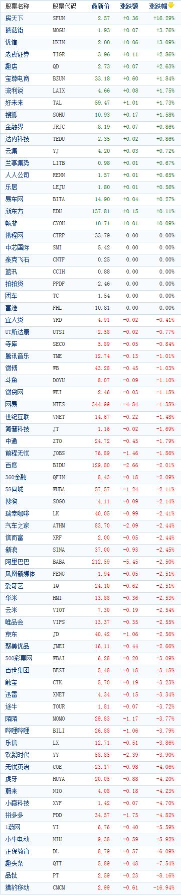 其他中概股中,蘑菇街(美股MOGU)上漲3.76%,優信上漲3.09%,老虎證券(美股TIGR)上漲2.86%,趣店上漲2.63%,寶尊電商上漲1.84%,流利說上漲1.75%,好未來(美股XRS)上漲1.73%,搜狐(美股SOHU)上漲1.58%,易車上漲0.27%,新東方上漲0.11%,暢遊(美股CYOU)上漲0.09%;宜人貸下跌0.41%,寺庫下跌0.84%,騰訊音樂(美股TME)下跌1.01%,微博下跌1.03%,鬥魚下跌1.10%,微貸網(美股WEI)下跌1.18%,網易(美股NTES)下跌1.38%,中通下跌1.79%,前程無憂(美股JOBS)下跌1.86%,58同城(美股WUBA)下跌2.11%,搜狗下跌2.14%,瑞幸咖啡(美股LK)下跌2.41%,汽車之家(美股ATHM)下跌2.44%,新浪(美股SINA)下跌2.45%,愛奇藝下跌2.51%,華米下跌2.53%,雲米下跌2.54%,唯品會下跌2.55%,迅雷(美股XNET)下跌3.34%,途牛下跌3.72%,陌陌下跌3.77%,哔哩哔哩下跌3.79%,樂信下跌3.86%,歡聚時代(美股YY)下跌3.90%,無憂英語下跌4.06%,虎牙下跌4.20%,蔚來下跌4.23%。