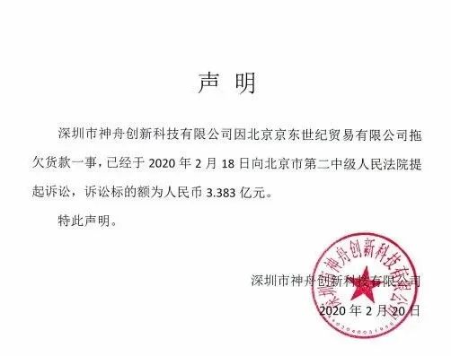 2月20日,神舟在微博公開指責京東,稱其拖欠其3.383億的貨款沒有歸還。對此,京東在當天回擊,表示因為神舟違反協議條款,才導致其未結算貨款被暫緩支付。