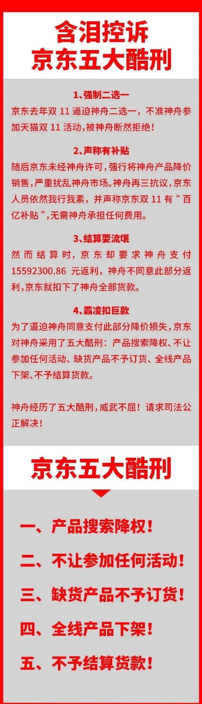 到了21號,神舟回應,因未和京東在去年雙11簽訂二選一,京東就在未告知的情況下,對神舟産品進行補貼促銷,事後卻逼迫神舟繳納1559萬元返利,並采取了五大酷刑,這其中就包括不結算貨款。