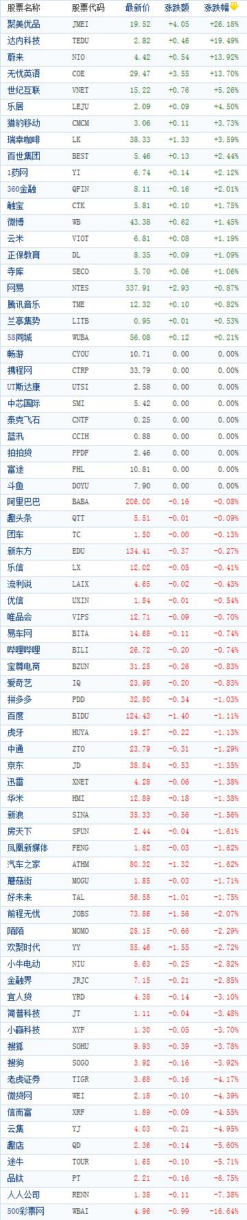 其他中概股中,世紀互聯上漲5.26%,樂居上漲4.50%,獵豹移動上漲3.73%,瑞幸咖啡(美股LK)上漲3.59%,百世上漲2.44%,360金融(美股QFIN)上漲2.01%,微博上漲1.45%,雲米上漲1.19%,寺庫上漲1.06%,網易(美股NTES)上漲0.87%,騰訊音樂(美股TME)上漲0.82%,58同城(美股WUBA)上漲0.21%,團車下跌0.13%,新東方下跌0.27%,樂信下跌0.41%,優信下跌0.54%,唯品會下跌0.70%,易車下跌0.74%,哔哩哔哩下跌0.74%,寶尊電商下跌0.83%,愛奇藝下跌0.83%,虎牙下跌1.13%,中通下跌1.29%,迅雷(美股XNET)下跌1.38%,新浪(美股SINA)下跌1.56%,汽車之家(美股ATHM)下跌1.62%,蘑菇街(美股MOGU)下跌1.71%,好未來(美股XRS)下跌1.75%,前程無憂(美股JOBS)下跌2.07%,陌陌下跌2.29%,歡聚時代(美股YY)下跌2.72%,宜人貸下跌3.10%,搜狐(美股SOHU)下跌3.78%,搜狗下跌3.92%,老虎證券(美股TIGR)下跌4.17%,雲集(美股YJ)下跌4.95%。