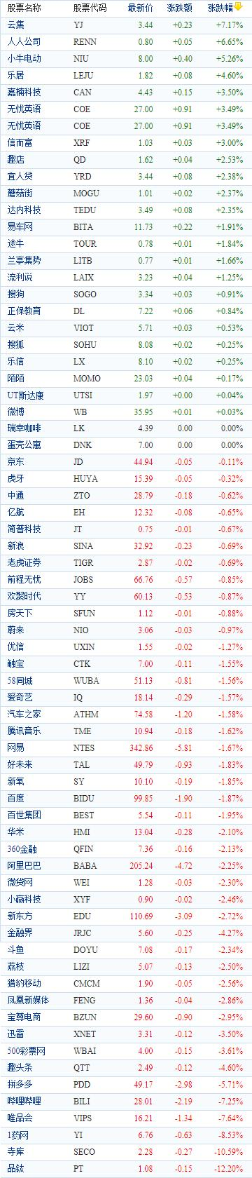 其他中概股中,樂居上漲4.60%,嘉楠科技(美股CAN)上漲3.50%,無憂英語上漲3.49%,信而富上漲3.00%,趣店上漲2.53%,宜人貸上漲2.38%,蘑菇街(美股MOGU)上漲2.37%,易車網(美股BITA)上漲1.91%,途牛上漲1.84%,流利說上漲1.25%,搜狗上漲0.91%,雲米上漲0.53%,搜狐(美股SOHU)上漲0.25%,樂信上漲0.25%,陌陌上漲0.17%,微博上漲0.03%;虎牙下跌0.32%,億航(美股EH)下跌0.65%,新浪(美股SINA)下跌0.69%,老虎證券(美股TIGR)下跌0.69%,前程無憂(美股JOBS)下跌0.85%,歡聚時代(美股YY)下跌0.87%,蔚來下跌0.97%,優信下跌1.27%,觸寶下跌1.55%,58同城(美股WUBA)下跌1.56%,愛奇藝下跌1.57%,汽車之家(美股ATHM)下跌1.58%,騰訊音樂(美股TME)下跌1.62%,網易(美股NTES)下跌1.67%,好未來(美股XRS)下跌1.83%,新氧下跌1.85%,華米下跌2.10%,360金融(美股QFIN)下跌2.13%,鬥魚下跌2.34%,小贏科技下跌2.46%,荔枝(美股LIZI)下跌2.50%,獵豹移動下跌2.56%,新東方下跌2.72%,迅雷(美股XNET)下跌3.50%,趣頭條下跌4.60%。