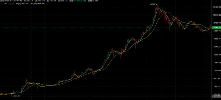 第二次減半是2016年7月10日,當日減半的價格為645.32,減半後半年,一直到17年1月4日,價格達到了1075美金。這次行情的影響,也只有從半年後的視角來看,才能看的比較明顯。