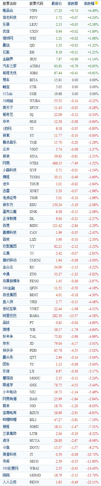 其他中概股中,樂居上漲2.38%,優信上漲1.89%,微貸網(美股WEI)上漲1.68%,趣店上漲1.32%,億航(美股EH)上漲1.21%,汽車之家(美股ATHM)上漲0.95%,前程無憂(美股JOBS)上漲0.61%;58同城(美股WUBA)下跌0.25%,房天下下跌0.26%,愛奇藝下爹0.54%,華米下跌0.64%,1藥網(美股YI)洗啊得0.80%,新氧下跌0.84%,騰訊音樂(美股TME)下跌1.26%,雲米科技下跌1.37%,新浪(美股SINA)下跌1.51%,網易(美股NTES)下跌1.52%,小贏科技下跌1.54%,攜程下跌1.60%,途牛下跌1.94%,迅雷(美股XNET)下跌1.96%,老虎證券(美股TIGR)下跌1.96%,新東方下跌2.08%,蛋殼公寓下跌2.09%,正保教育下跌2.27%,嘉楠科技(美股CAN)下跌2.45%,荔枝(美股LIZI)下跌2.50%,歡聚集團(美股YY)下跌2.52%,雲集(美股YJ)下跌2.81%,獵豹移動下跌3.00%,金山雲(美股KC)下跌3.22%,中通下跌3.82%,鳳凰新媒體(美股FENG)下跌3.97%,360金融(美股QFIN)下跌4.16%,百世集團(美股BSTI)下跌4.30%,宜人貸下跌4.48%,世紀互聯下跌4.51%,品钛下跌4.60%,微博下跌4.64%,好未來(美股XRS)下跌4.99%,趣頭條下跌5.04%,團車下跌5.04%,樂信下跌5.17%,蘑菇街(美股MOGU)下跌5.24%,跟誰學(美股GSX)下跌5.44%,小牛電動(美股NIU)下跌5.46%,網易有道下跌5.94%,蔚來下跌6.03%,寶尊電商下跌6.95%,哔哩哔哩下跌7.10%,搜狐(美股SOHU)下跌7.51%,蘭亭集勢下跌8.52%。
