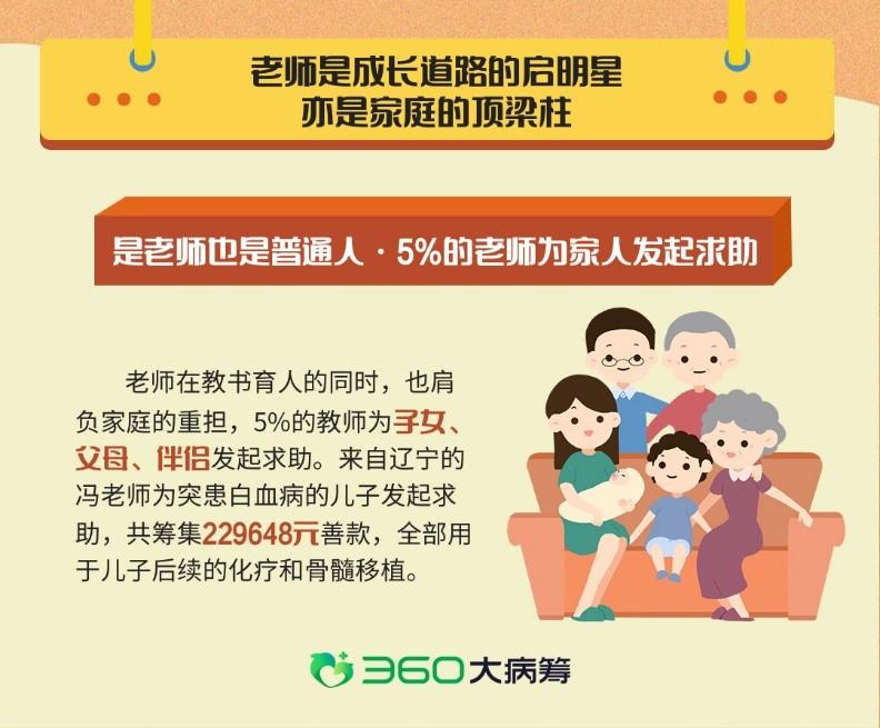 老師在教書育人的同時,也肩負著家庭的重擔。360大病籌數據顯示,在教師發起的籌款中,約5%的老師為子女、父母或伴侶等親屬發起求助。如來自遼甯蓋州的馮老師,他的兒子剛剛大學畢業卻突患白血病。在掏空家里所有積蓄,花費十幾萬元治療費用後,家庭實在無力承擔後續高額的花費,不得不在360大病籌發起求助。短短幾天,在360大病籌愛心人士的接力下,馮老師共為兒子籌集229648元善款,全部用于後續的化療和骨髓移植。