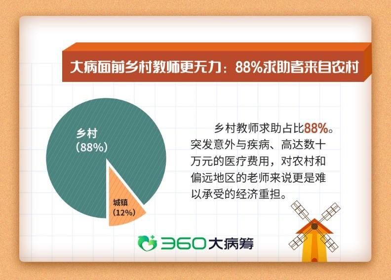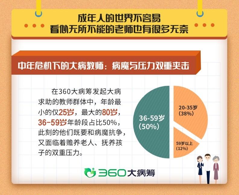 作為備受社會尊重的群體之一,教師的保障始終受到重視,但由于教師群體分布範圍廣泛,各地待遇差距較大等因素的影響,仍有許多教師家庭在突遇重大疾病或意外時,陷入無力支付高昂治療費用的困境。在360大病籌發起求助的大病教師中,年齡最小的僅25歲,最大的80歲。其中,36-59歲的中年教師求助占比50%,此刻的他們既要和病魔抗爭,又面臨著贍養老人、撫養孩子的雙重壓力。而突發意外與疾病、高達數十萬元的醫療費用,對農村和偏遠地區的老師來說是難以承受的重擔,鄉村老師求助比例約占教師群體的88%。