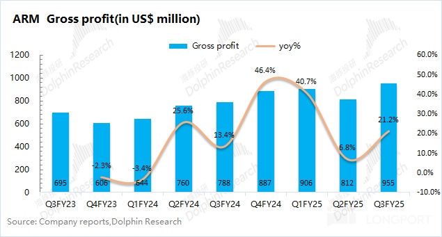 ARM 在 2025 財年第三季度(即 24Q4)實現毛利 9.55 億美元,同比增長 21.1%。毛利端同比增速略高於收入端。
