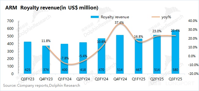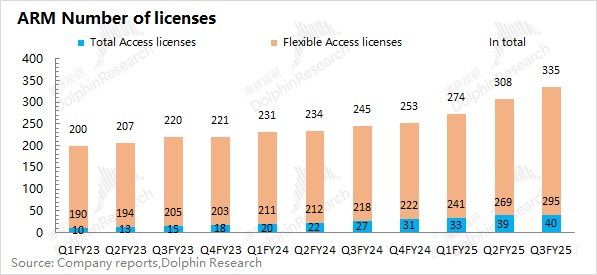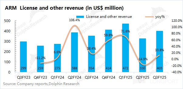 ARM 的許可證業務在 2025 財年第三季度(即 24Q4)實現營收 4.03 億美元,同比增長 13.8%。