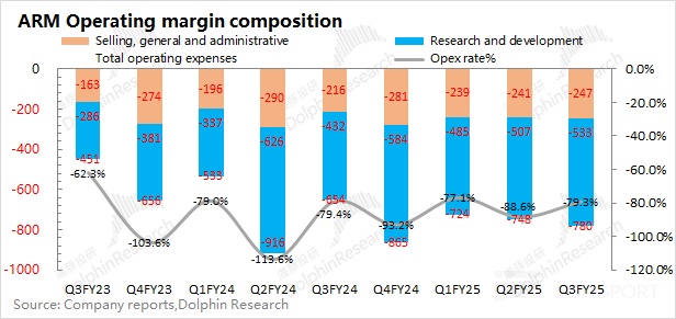 ARM 在 2025 財年第三季度(即 24Q4)的經營費用為 7.8 億美元,同比增長 19.3%。公司保持高投入,當前經營費用率仍高達 79.3%。