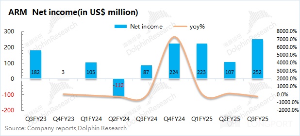 ARM 在 2025 財年第三季度(即 24Q4)實現淨利潤 2.52 億美元,同比環比均有所增長,好於市場預期(2.02 億美元)。如果單純看經營面情況,公司本季度經營性利潤環比提升至 1.75 億美元,主要得益於營收規模的擴大。