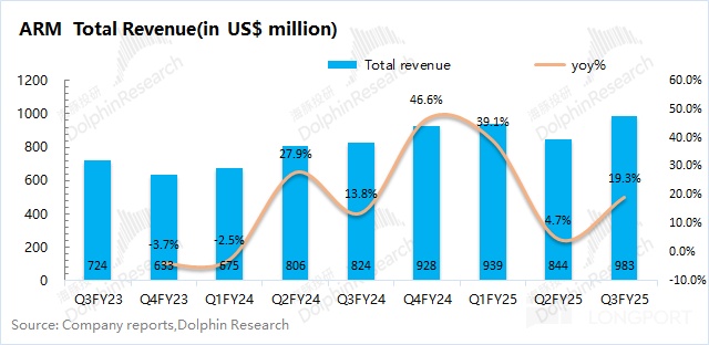 ARM 在 2025 財年第三季度(即 24Q4)實現營收 9.83 億美元,同比上升 19.3%,略好於市場預期(9.48 億美元)。公司本季收入繼續提升,其中本季度許可證業務和版稅業務都有兩位數的增長。