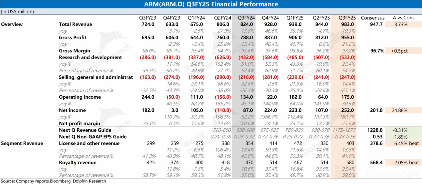 一、整體業績:收入&利潤,都在增長。ARM 在 2025 財年第三季度(即 24Q4)實現營收 9.83 億美元,同比增長 19.3%,略好於市場預期(9.48 億美元)。本季度收入端的增長,主要得益於許可證業務和版稅業務的雙雙增長;$Arm(ARM.US) 本季度淨利潤 2.52 億美元,同比增幅明顯,略好於市場預期(2.02 億美元)。在規模效應的影響下,公司經營費用率有所回落,公司業績再次增長。