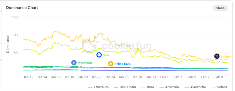 BNB Chain 最近的增長主要是 2 個項目的帶動,一個是 Andy BNB,2 月 10 日的市值約為 4200 萬美元,近七天的 Mindshare 增長了 1.02,達到 1.44%,另一個是 CHEEMS,2 月 10 日的 Mindshare 約為 0.97%,市值約為 1.44 億美元。