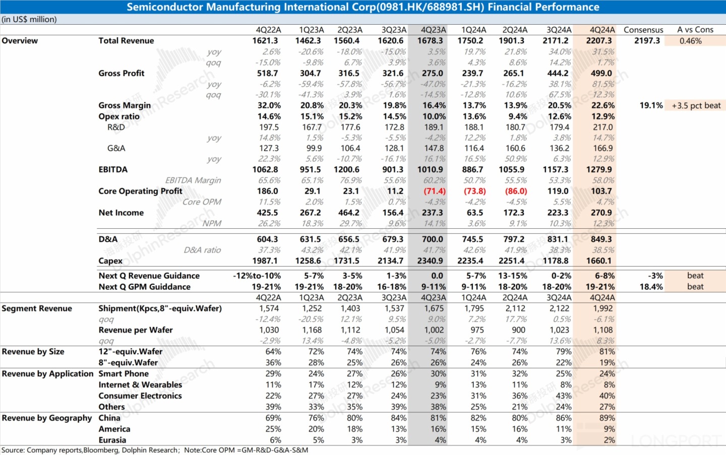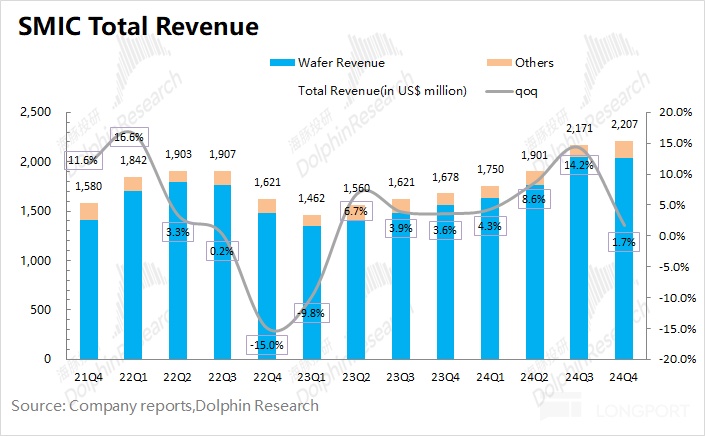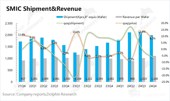 2024 年第四季度中芯國際實現營收 22.07 億美元,環比增加 1.7%,符合指引區間(環比增長 0-2%)。公司本季度的出貨量環比有所回落,而價格端環比繼續明顯提升。