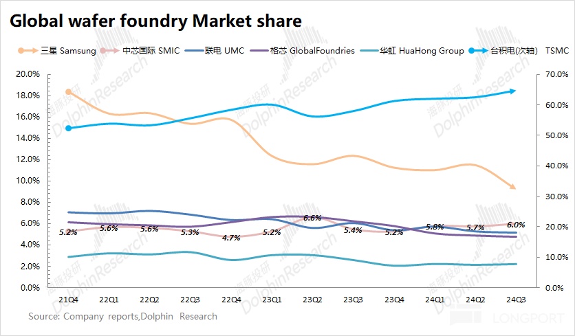 此外,海豚君也認為中芯國際的股價持續上升,也和市場對公司的認知發生變化有關。從全球晶圓市場的份額角度來看,除台積電份額持續提升以外,只有中芯國際還是穩中有升的。前 6 大公司中,聯電的收入體量最接近於中芯國際,但兩者卻有明顯不同:1)聯電的市場份額是在下滑的,而中芯國際有所提升;2)中芯國際受益於國産化轉單等需求推動;3)中芯國際已經具備進入10nm 及以下技術的能力。因此,在確定性和成長性角度,中芯國際當前都優於聯電,市場也給予了中芯國際相對更高的估值。