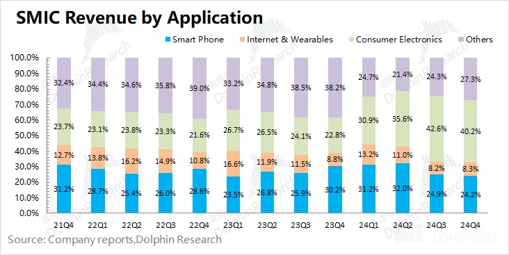 本季度中芯國際的智能手機業務收入佔比為 24.2%,雖然佔比回落,但季度收入仍在 5 億美元左右。消費電子業務本季度佔比繼續維持在 40.2% 的相對高位,是公司最大的收入來源。在補貼政策的影響下,公司的消費電子收入在近兩個季度都有明顯提升。(結合高通 IoT 業務的同比增長也有 36% 的增長)。