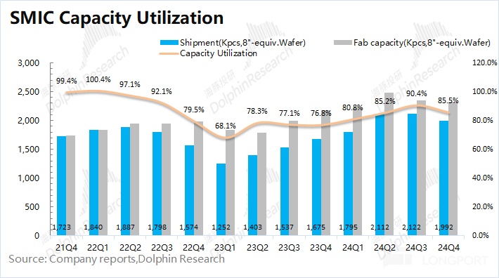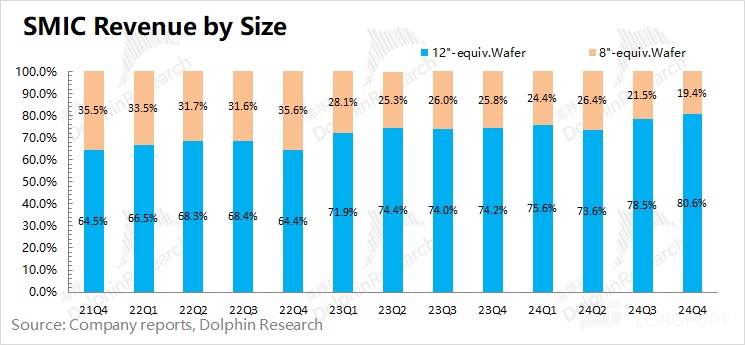 2024 年第四季度中芯國際的産能利用率 85.5%,本季度公司的産能利用率有所回落。海豚君認為當前需求面仍顯結構化特徵,其中公司 12 寸晶圓需求相對不錯,而 8 寸晶圓需求仍舊低迷,這直接影響了公司本季度的産能利用率。