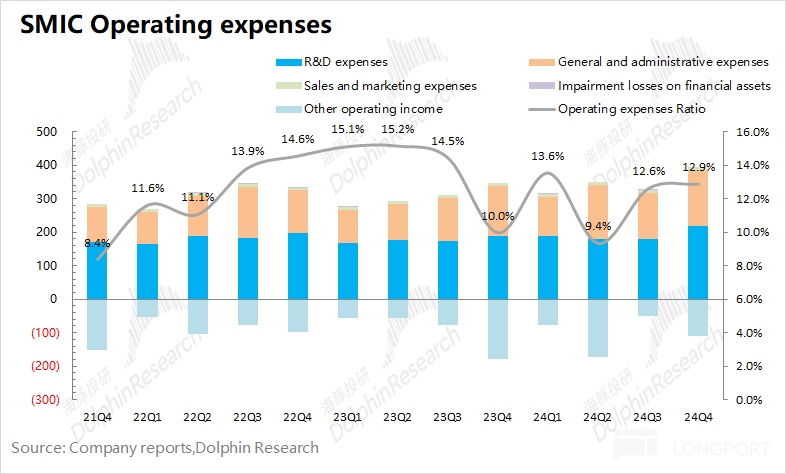 從經營開支角度看,本季度中芯國際經營開支是 2.85 億美元,略有提升,主要是公司本季度研發費用和行政費用均有所增加。本季度經營開支佔比維持在 12.9%。