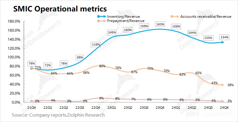 結合資産負債表中存貨&應收賬款和收入之間的關係,本季度存貨/收入和應收賬款/收入分別為 134% 和 38.1%。從營運指標的角度看,中芯國際的存貨佔比略有回升。由於傳統半導體行業還未迎來全面回暖,公司當前經營面也呈現出 「12 寸需求好,8 寸需求弱」 的結構性特徵,對存貨端也帶來影響。