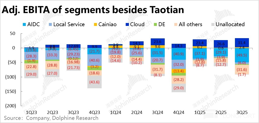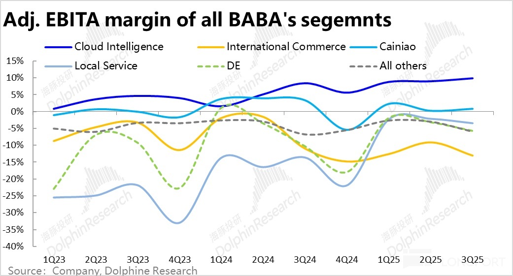 雖然重點業務板塊的增長都有顯著的改善,但本季利潤並不算大超預期。阿裡巴巴集團整體 adj.EBITA 為 549 億,僅是稍高於市場預期的 536 億。除了淘天和阿裡雲的利潤率呈改善趨勢,其他多數板塊或由於投入力度的增長, 本季的虧損幅度大多是擴大的,從而拖累了利潤表現。