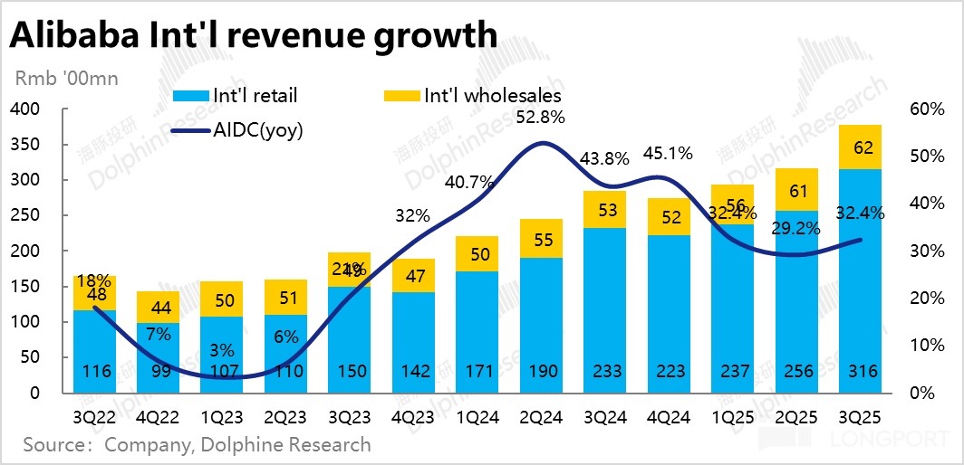 本季國際電商收入同比增長 32.4%。並沒像市場預期的有所降速,反而是環比加速增長的,好於預期 26.8% 的增速。其中國際零售業務的增速和上季大體一致,但國際批發業務的增長則環比由 9.4% 提升到了 18%,帶動了整體。