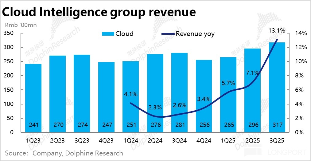 實際上,阿裡雲業務本季實現收入 317 億,同比增速 13%,明顯好於市場一致預期的 9.7%。雖然買方的實際預期在近期的上漲中可能已經提高到 10% 以上,但 3pct 的 beat 幅度,海豚投研認為對買方而言應當也是一個比較滿意的數據。