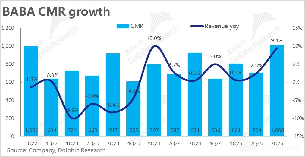 CMR 增長超預期強勁,歸功於 9 月初加收的 0.6% 服務費和全站推廣告工具的推廣對淘天變現率的利好,在本季度全面釋放。從 25 財年至今連續 3 個季度的 CMR 增長提速,基本確認了淘天的 take rate 止跌回升的趨勢。