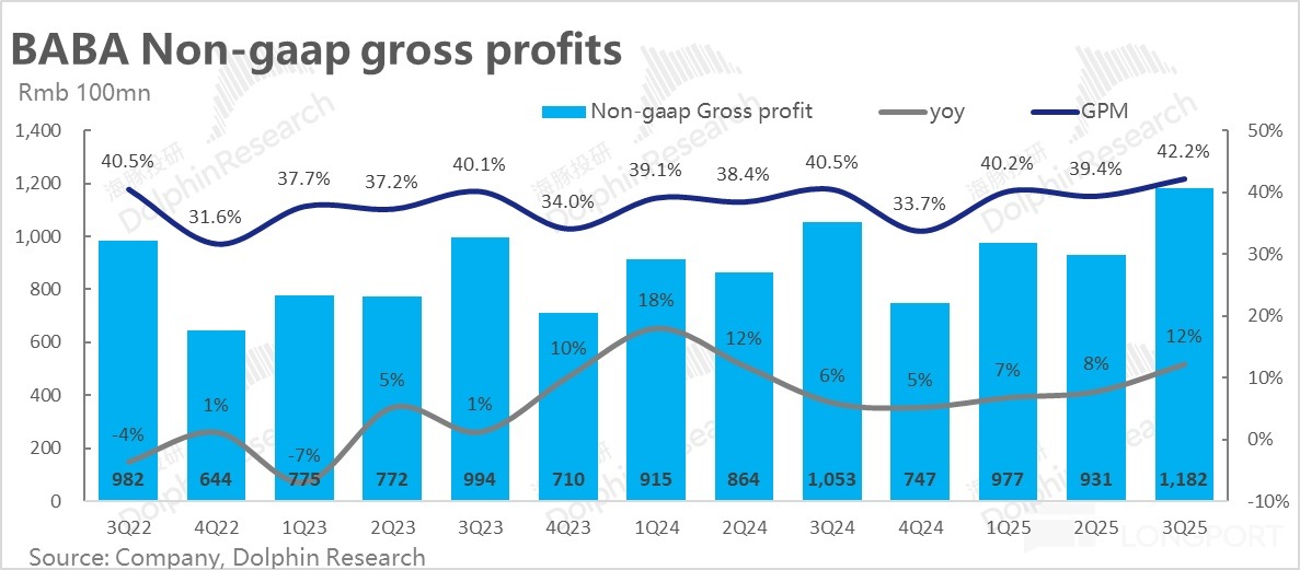 因此,CMR 增長超預期強勁,主要歸功於 9 月初加收的 0.6% 服務費和全站推廣告工具的推廣對淘天變現率的利好,在本季度全面釋放。從 25 財年至今連續 3 個季度的 CMR 增長提速,確認了淘天的 take rate 止跌回升的趨勢。展望後幾個季度,由於上述兩項利好效果的進一步釋放,不排除淘天的 take rate 有進一步走高的空間,但提升的速度可能會放緩。