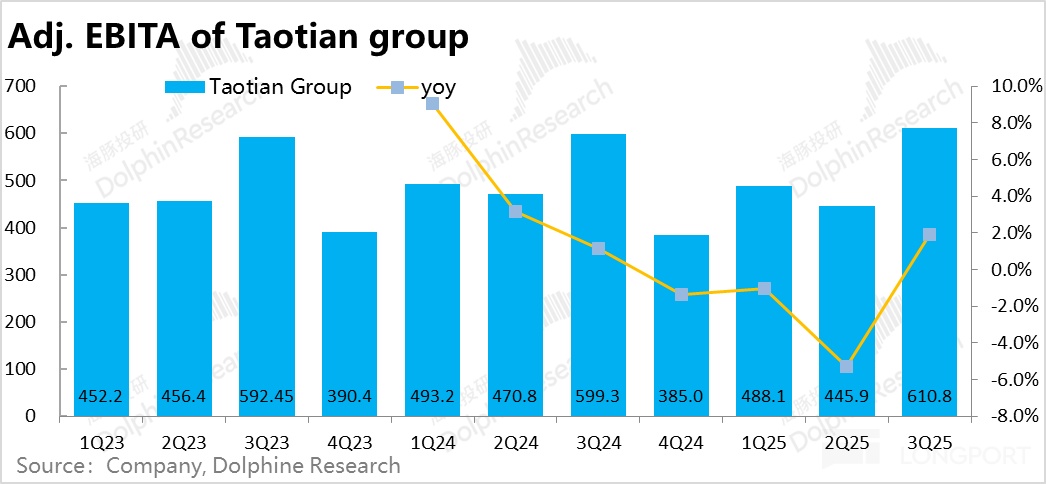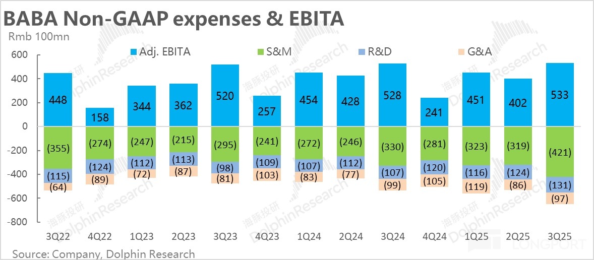 除了 CMR 增長的明顯好轉,淘天本季的利潤表現也還不錯。本季 adj.EBITA 為 611 億,同比正增長 2%。相比之下賣方預期中值同比下降約-2%,明顯更好。但我們也注意到,JPM 在業績前曾預期淘天本季利潤會同比正增長 6%,我們相信相當一部分資金應當了解到該消息,因此相比於買方的預期,實際 2% 的增長可能是符合預期的。結合本季度遠超預期的營銷支出,應當仍是對盈利産生了一定的拖累。