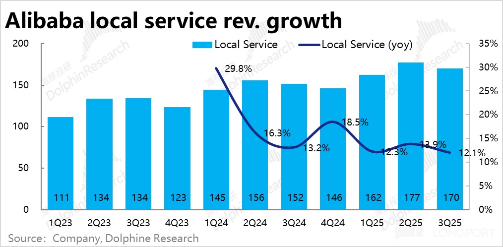 阿裡本地服務本季度業績表現則稍遜於預期,收入增長 12.1%,環比略有降速,不及市場預期的 13.5%,同時虧損也環比明顯擴大到 6 億,高於預期 5.2 億的虧損。 兩項指標結合來看,似乎是出現了競爭環境惡化的迹象。