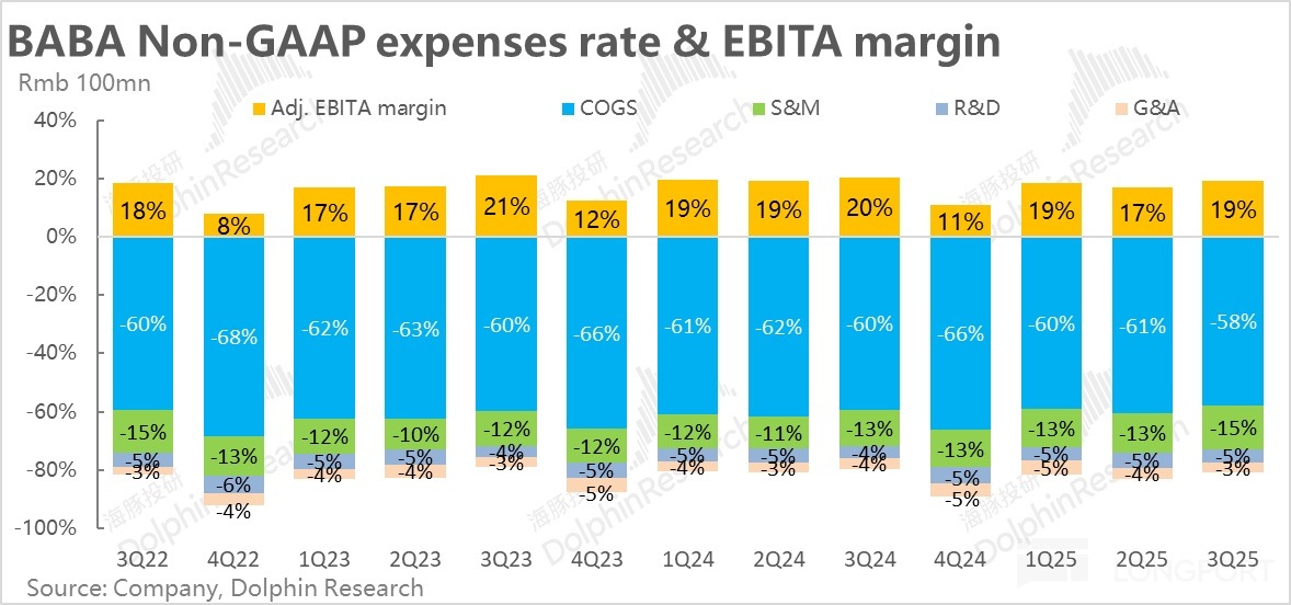 成本和費用角度,本季度阿裡剔股權激勵後的毛利率,相比去年同期提升了整 1.7pct。在主動剝離低效資産,和淘天、阿裡雲業務利潤率改善的帶動下,集團毛利率提升趨勢依舊。