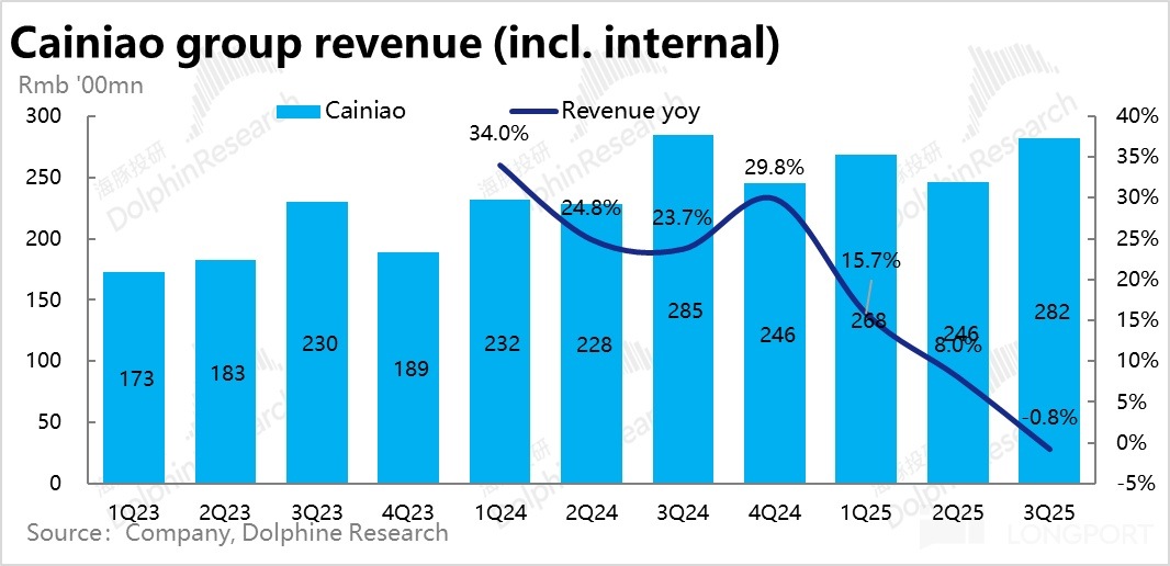 本季度菜鳥的收入增速出人意料的滑落到 0.8% 的負增長,在市場預期之外。如此顯著且預料外的增長波動,顯然有特殊事件影響,結合先前的新聞報導,菜鳥將原有部分與平台型業務重新劃分給了淘天和國際電商集團,應當是導致此次收入負增長的主要原因。因此先前國際電商集團(淘天受到的影響應當有些)的增長提升應當也有此次業務重新劃分的影響。