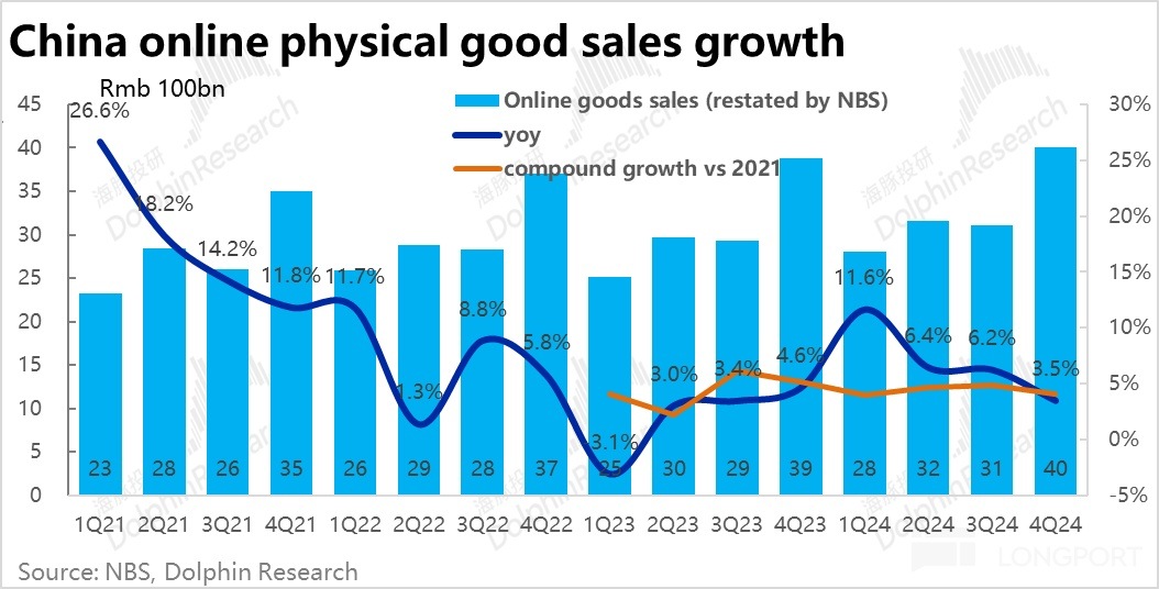 雖然 24 年四季度的宏觀社零數據顯示,整體綫上實物零售的增速環比從 6.2% 下降到了 3.5%,指向電商大盤的整體增長是邊際走弱的。不過阿裡和京東先前發佈的 4Q 業績指引則普遍比 3Q 有所改善,市場對淘天集團 CMR 增速預期相比 3Q 的 2.5% 改善到 5%~6%。實際本季度的國内零售客戶管理收入(CMR)同比增長了 9%,比一致預期的修復程度更強。