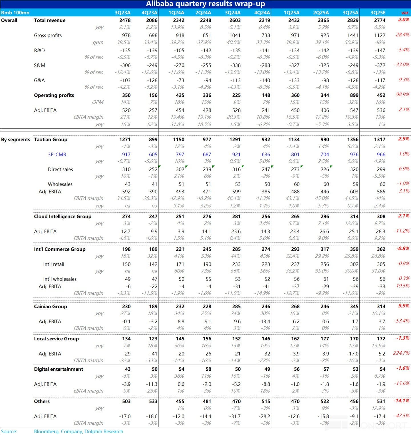 整體上,由於淘天、阿裡雲和國際電商板塊三大重點的收入增速普遍環比提前且超預期,其他各板塊除菜鳥應業務調整明顯 miss 外大體符合預期,阿裡集團整體本季收入增長約 5.4%,環比明顯加速且顯著高於預期的 2.1%。