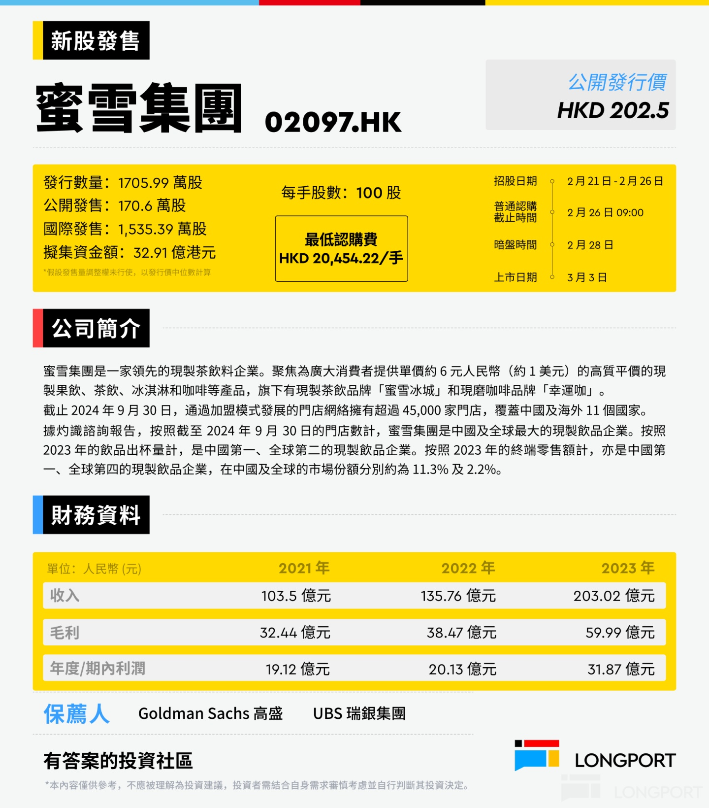 經營蜜雪冰城的$蜜雪集團(02097.HK) 2 月 21 起至 26 日招股,計劃發行 1706 萬股,一成在香港公開發售,招股價為 202.5 元,集資 34.5 億元,淨集資 32.91 億元,每手 100 股,一手入場費 20454.2 元。