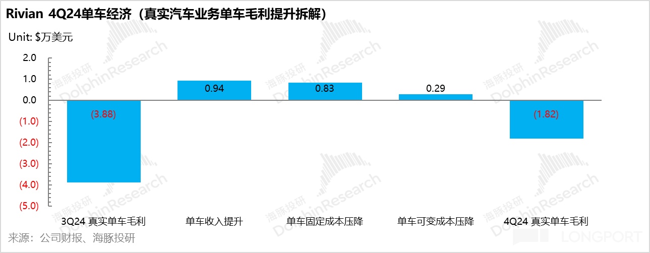 再結合四季度單車可變成本(基本都是材料成本)降本程度不及預期,可以預見,在真實的汽車業務表現上(剔除監管積分影響),2025 年的真實汽車業務毛利率可能相比 2024 Q4 還有繼續惡化的風險(第二代 R1 更新帶來的降本已經結束,單車收入還有繼續下降的風險,而單車固定成本由於 2025 年交付量同比下行預計還可能會上行),本季度的汽車業務毛利率提升趨勢可能並不能維持,Rivian 仍然預期 2025 年汽車毛利率為負數。