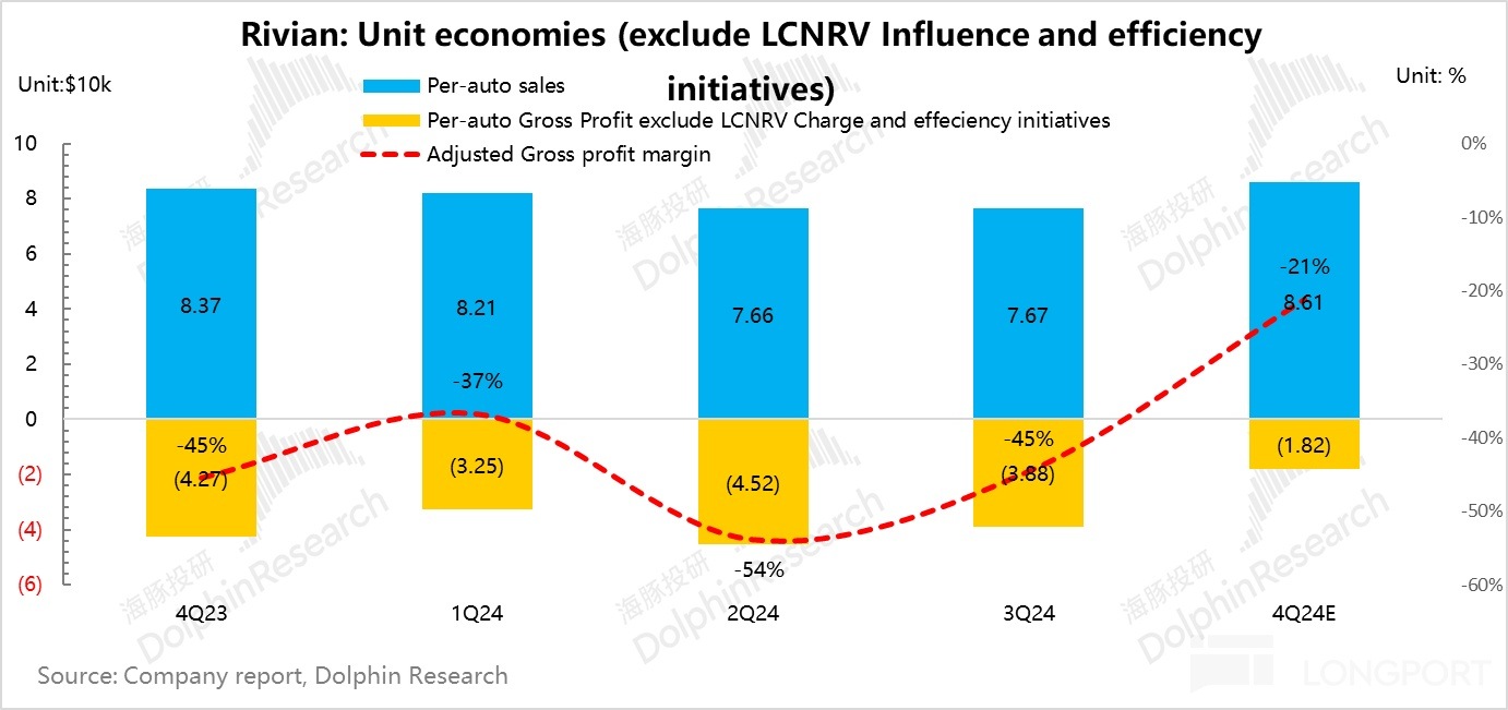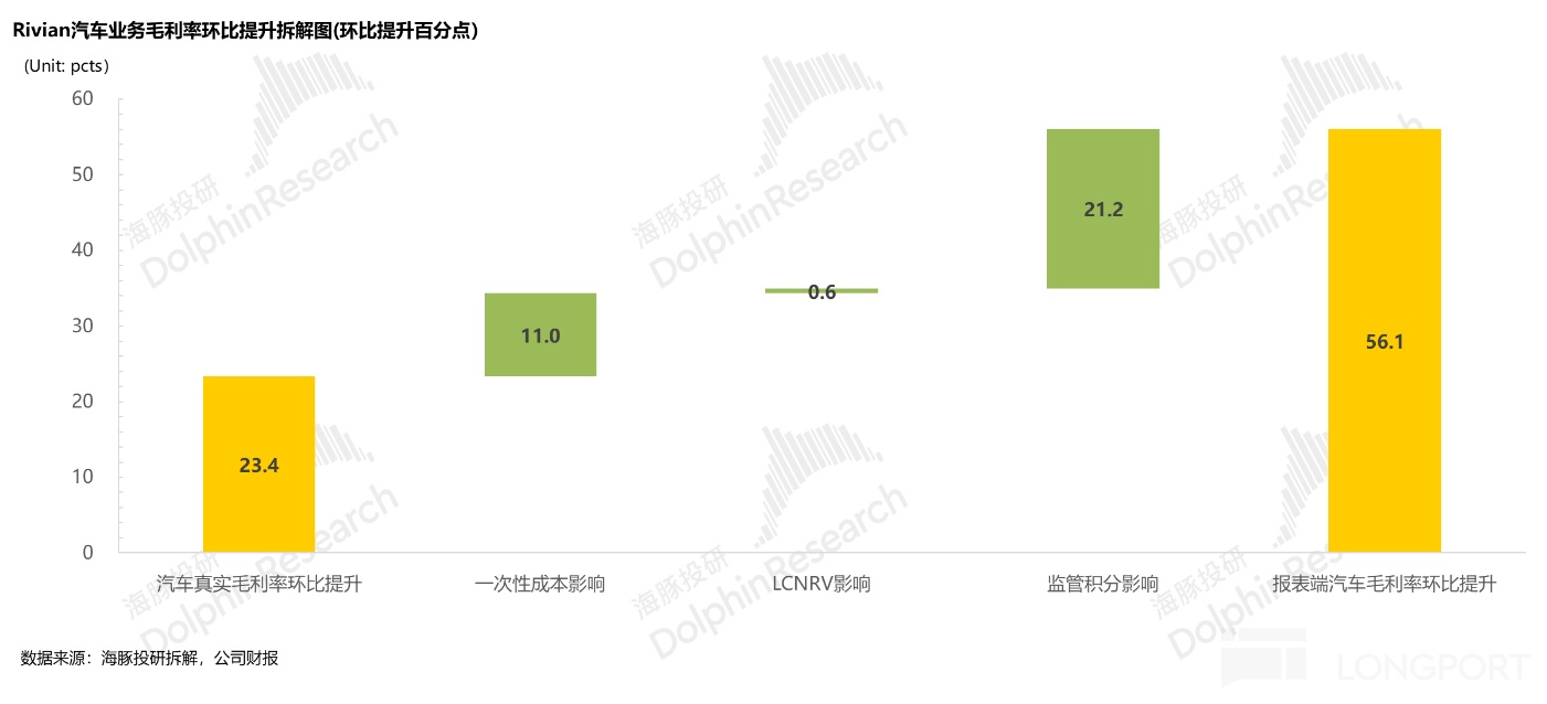 但 Rivian 其實汽車業務報表端的毛利還有存貨和合約減值沖回,以及一次性成本因素影響,但由於存貨和合約減值可沖回金額在 2025 年已經非常少,且一次性成本(主要和第二代 R1 更新有關的成本)幾乎也不會在 2025 年復現,所以為了觀測持續性,海豚君剔除了這兩個影響,觀察真實的汽車業務毛利率。