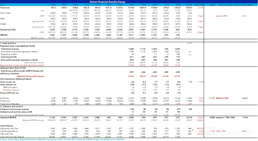 而同時從關鍵的汽車業務毛利率來看,由於指引隱含的需求薄弱,市場會擔心本季度上升的單車收入並不能維持,Rivian 在 2025 年仍然有較大的降價風險,尤其是在 IRA 補貼取消以及 Rivian 自身的車型的空白年情況下。