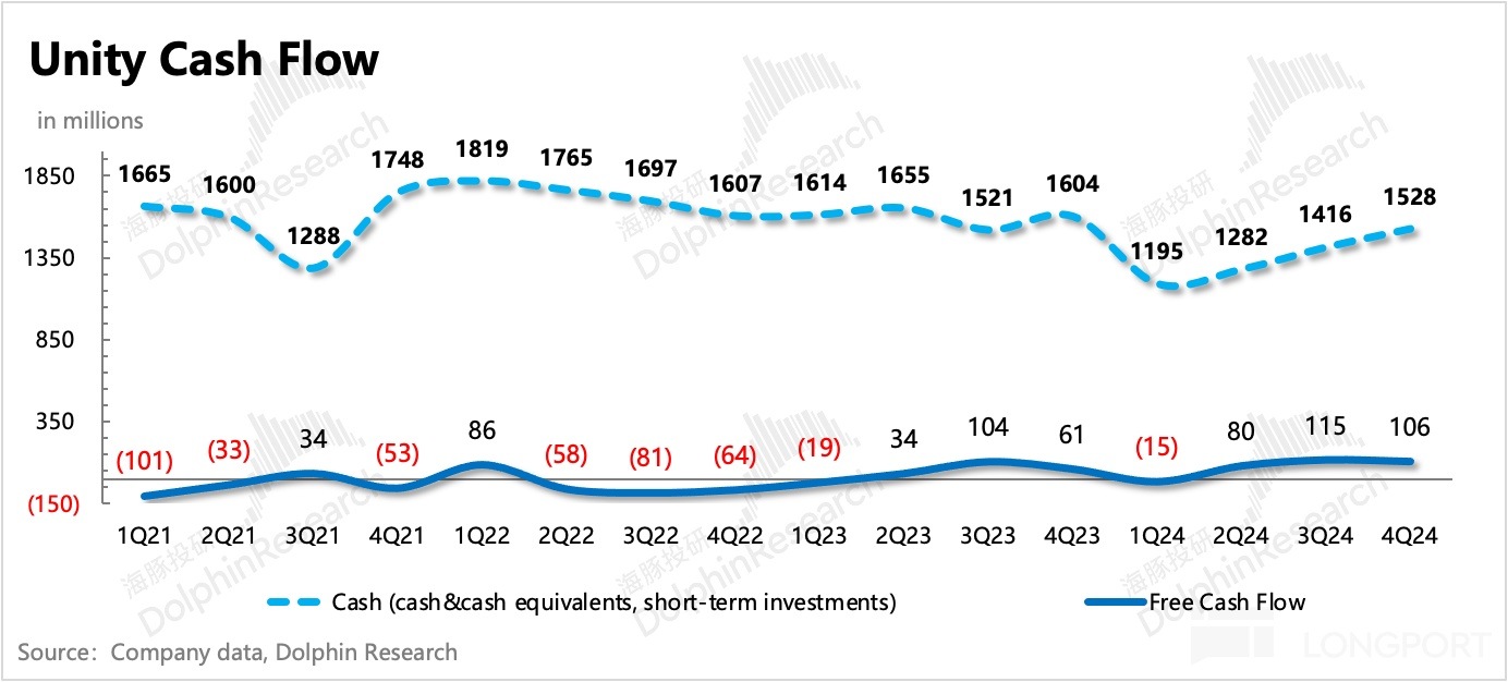 近一年淨擴張率持續下滑到 100% 以下,這其中應該還包括老客戶不滿於 Runtime 收費模式而不再續訂的影響。目前 Unity 與遊戲客戶之間的關係正在不斷修復,而非遊戲行業客戶,四季度訂閱收入同比增長超過 50%,表明 Unity 6 的需求強勁,尤其是汽車、零售領域。
